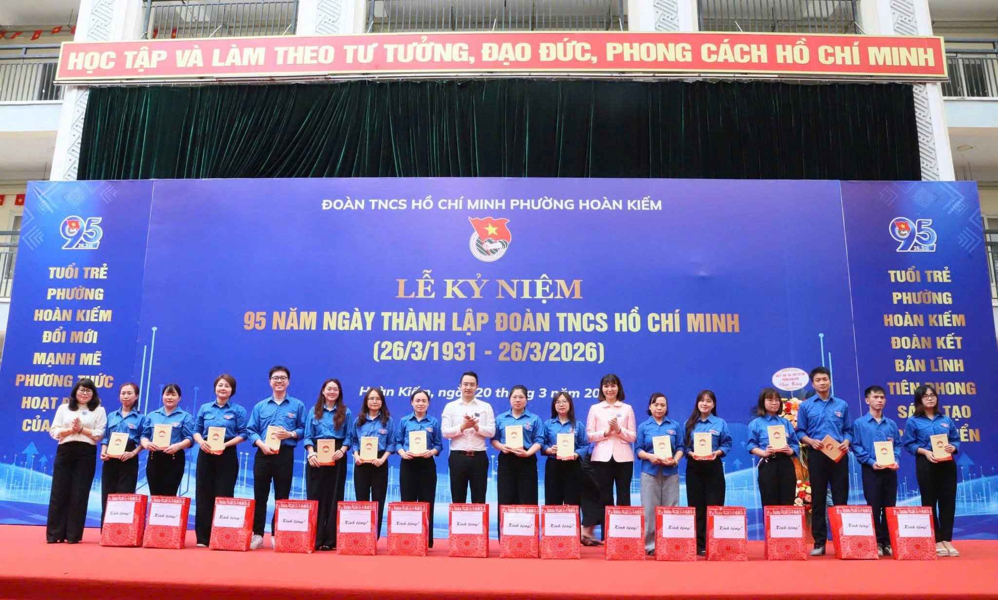 Nhân dịp này, Thường trực Đảng ủy phường đã tặng hoa chúc mừng, ghi nhận và biểu dương những kết quả nổi bật trong công tác Đoàn và phong trào thanh thiếu nhi trên địa bàn, đồng thời thể hiện sự quan tâm, tin tưởng đối với vai trò của tuổi trẻ trong sự phát triển chung của phường Hoàn Kiếm. Cũng trong khuôn khổ chương trình, Thường trực Đoàn phường đã trao quà tri ân tới các đồng chí trong Ban Liên lạc Cán bộ Đoàn Hoàn Kiếm qua các thời kỳ, thể hiện sự trân trọng đối với những đóng góp của các thế hệ đi trước. Trong Chương trình, 06 tập thể Đoàn tiêu biểu đã được biểu dương, khen thưởng nhằm ghi nhận những thành tích xuất sắc trong công tác Đoàn và phong trào thanh thiếu nhi Tháng Thanh niên năm 2026.